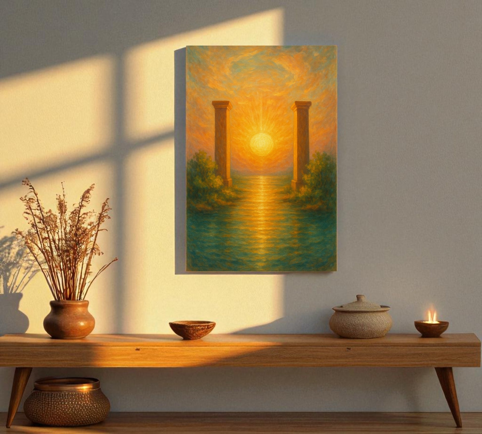 Sacred Symbolism: The rising sun represents rebirth and divine timing. Twin pillars form a gateway to balance and new possibilities. Golden water reflects emotional healing, while the expansive sky embodies limitless space.